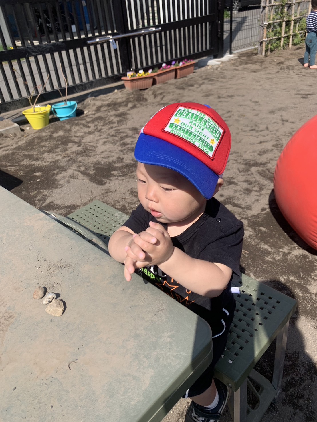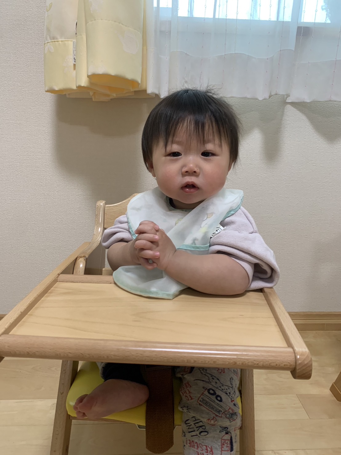 夕方のおやつの時間、いただきますの前に自分でスタンバイして待っていました。以前は、このような時間も泣いていたお友だちもいましたが、園生活に慣れ、楽しみもわかってくると、自ら向かおうとする気持ちも芽生えてきます♪