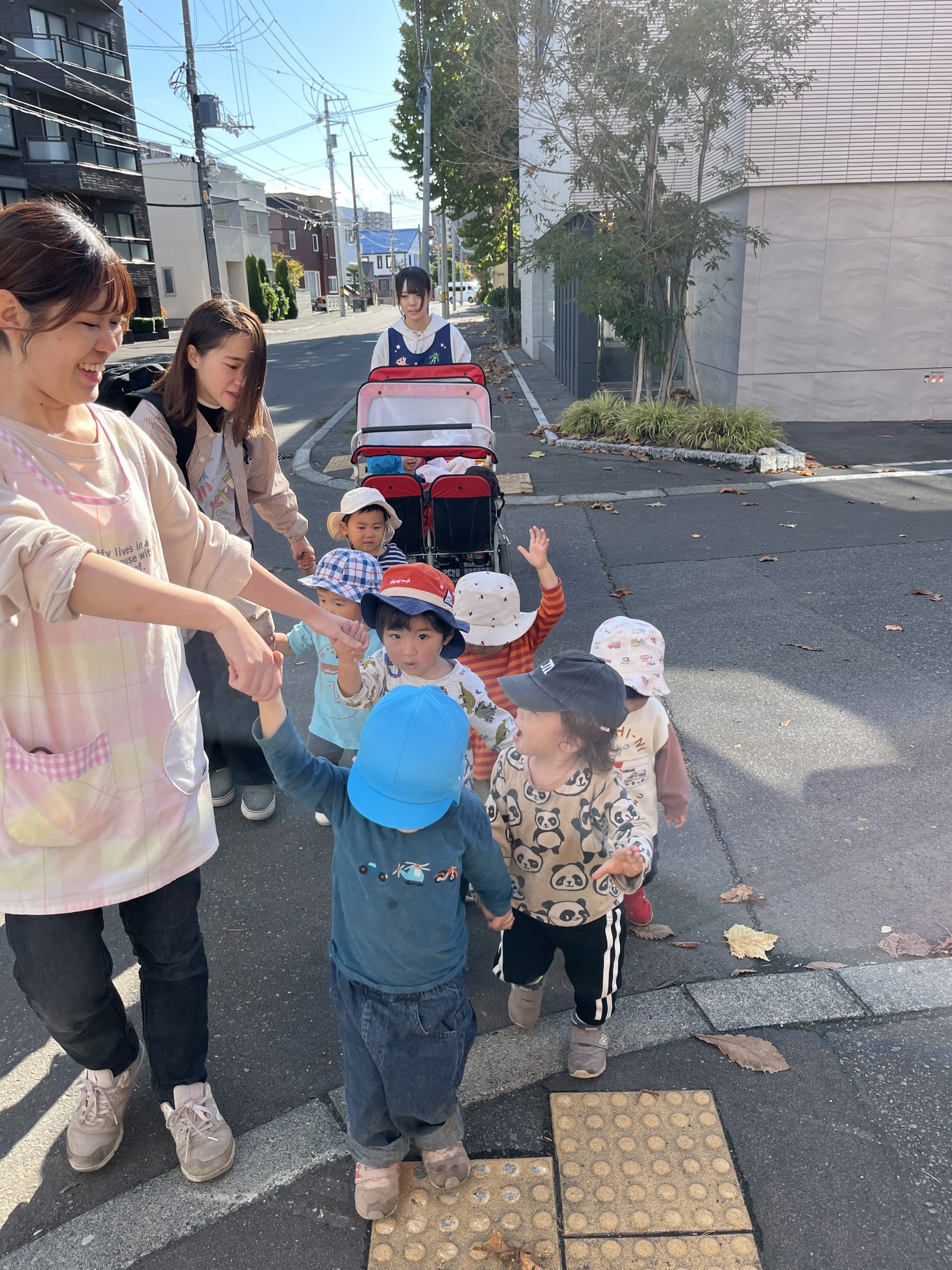お友だちや先生と手を繋いで歩いています