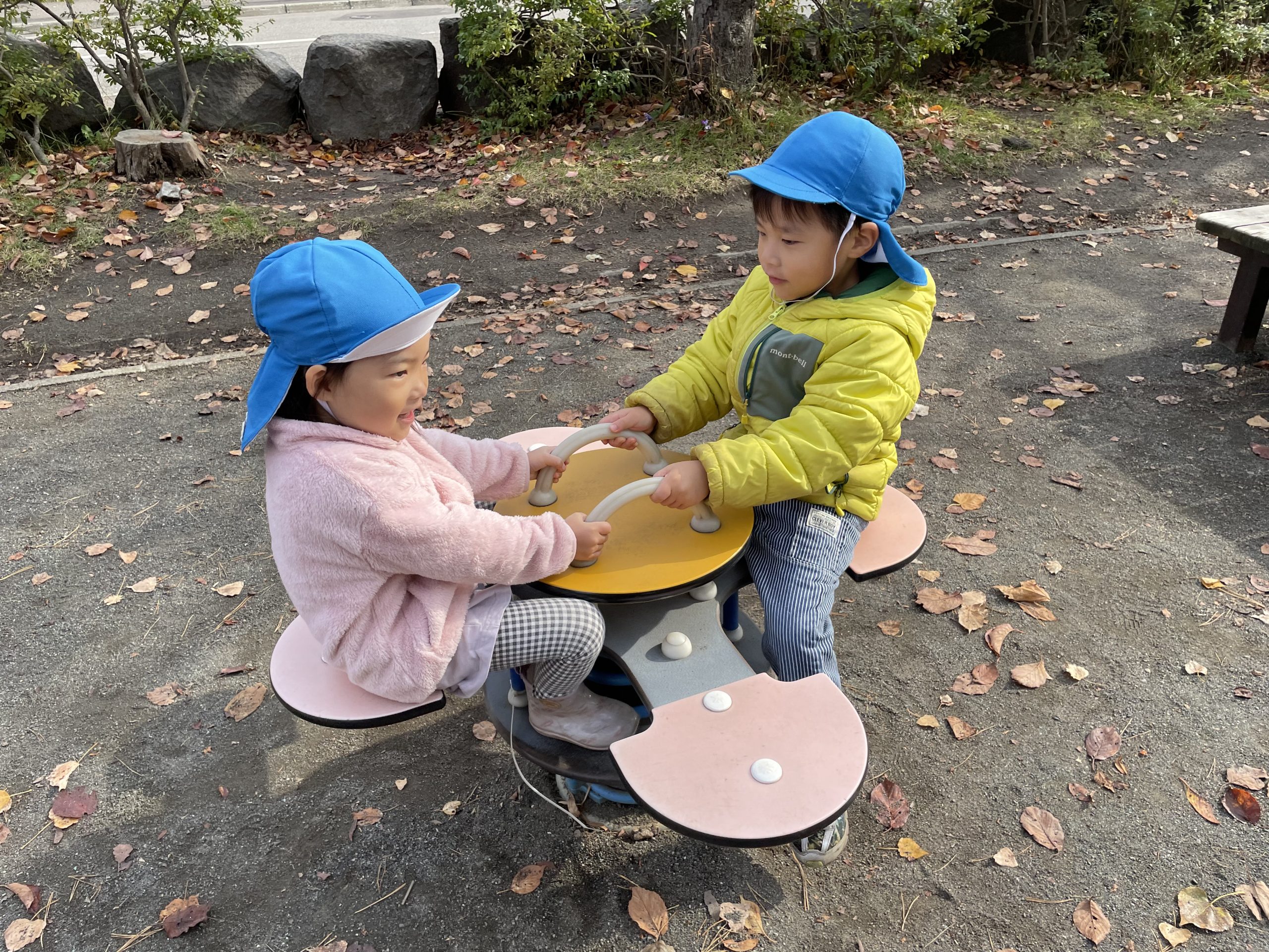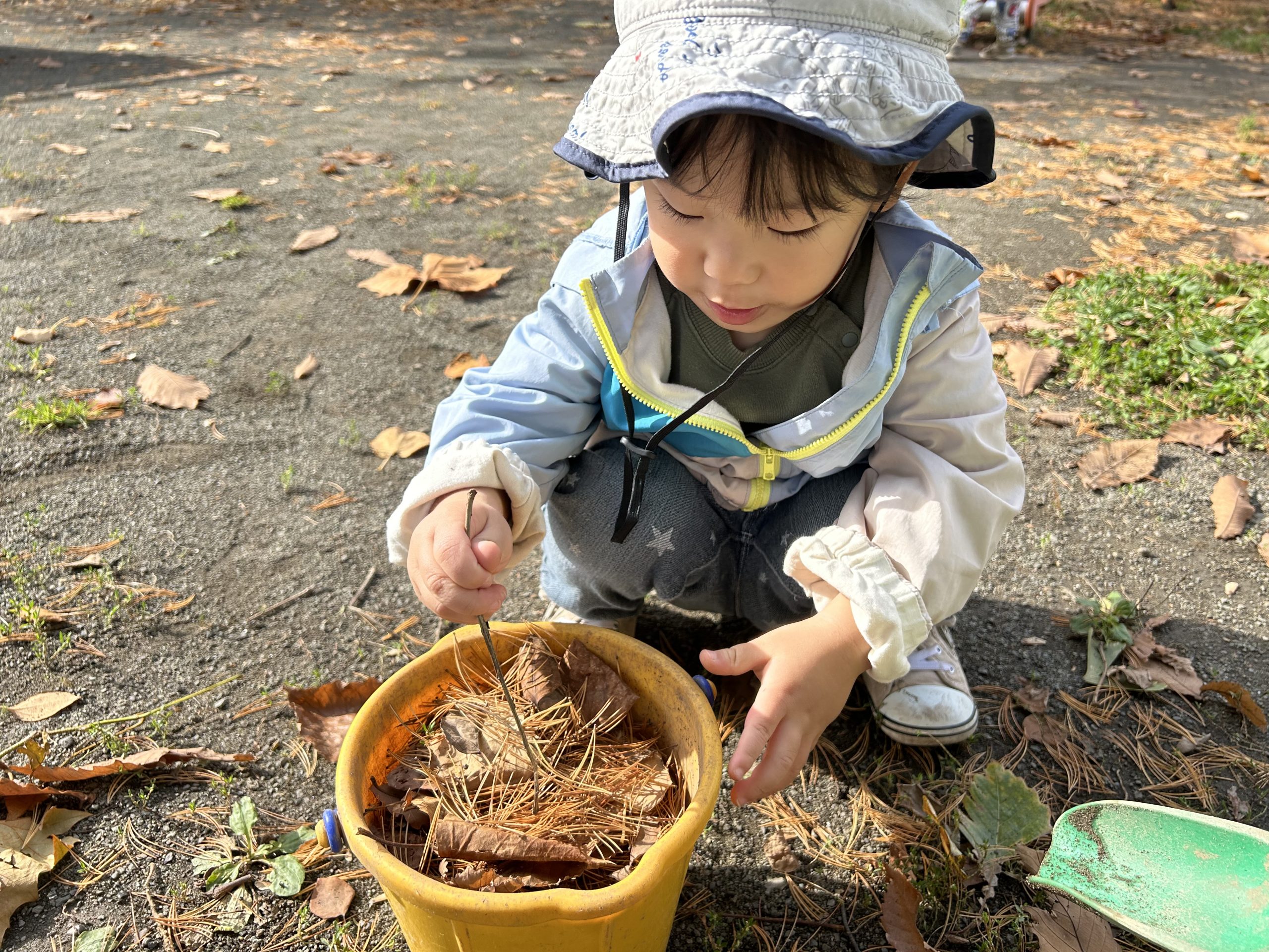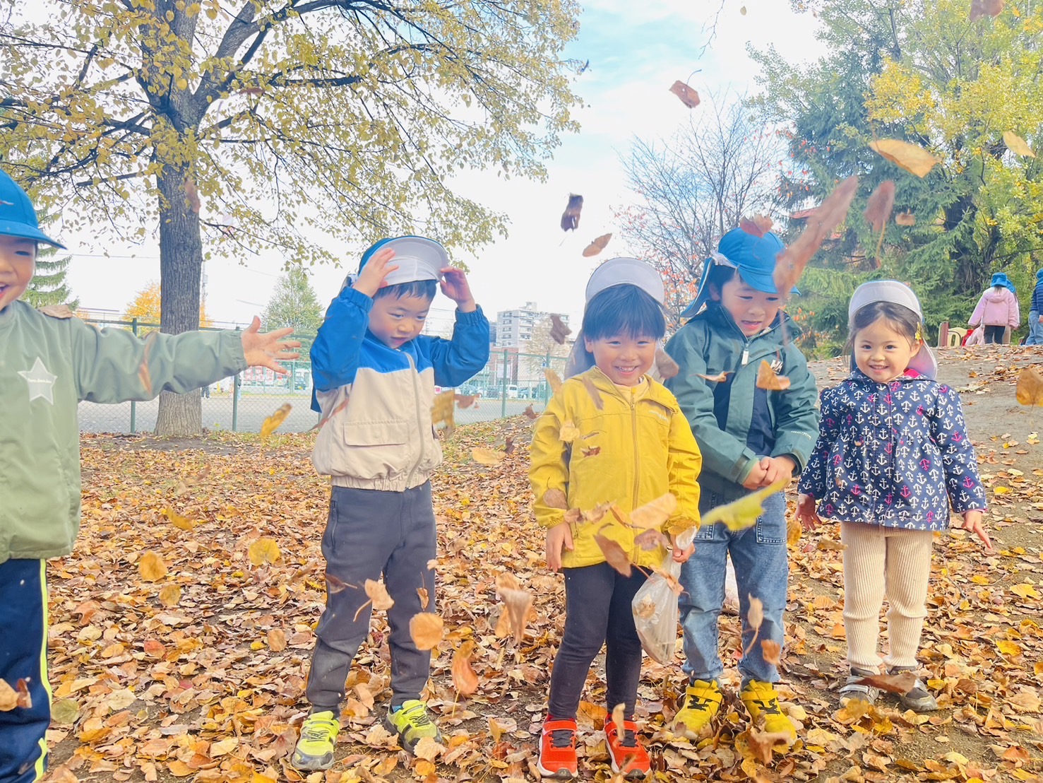 公園にはい〜っぱいの落ち葉があって、みんなで集めて〜
