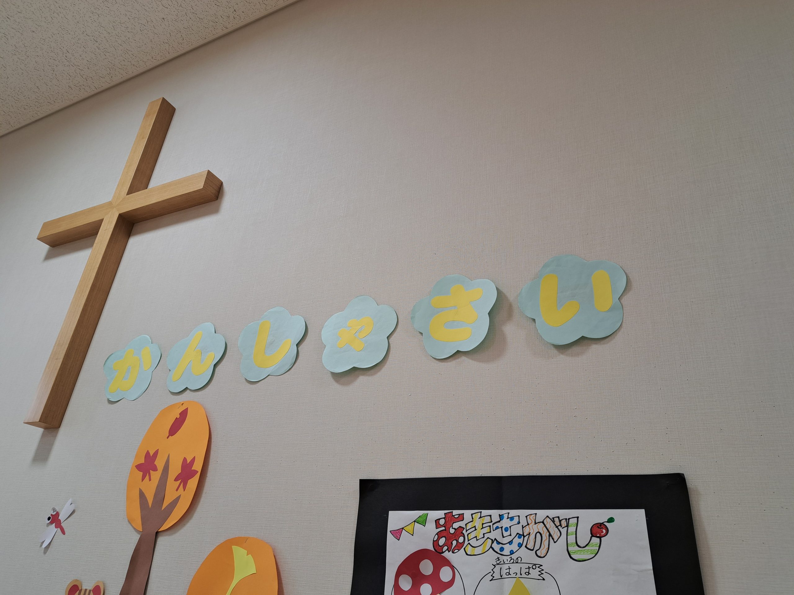 いつもと違うのは、聖壇の上に野菜が置いてあり、ホールの壁には「かんしゃさい」の文字が。