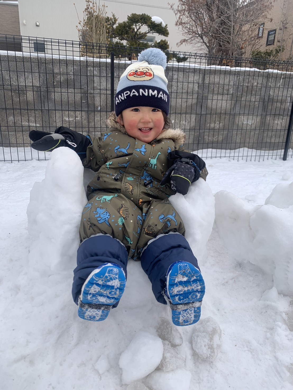 雪を手にし、口をもぐもぐ動かす姿を