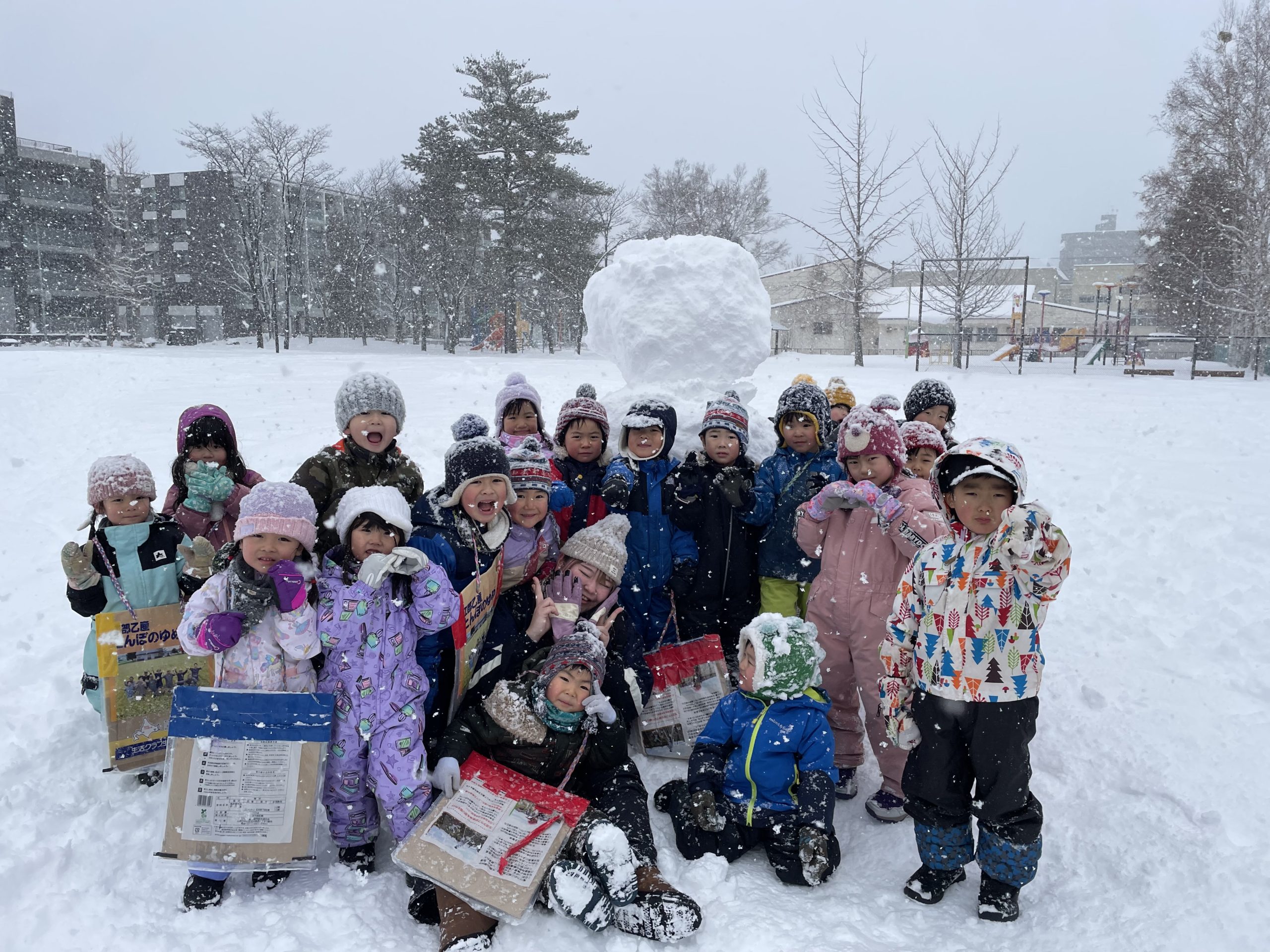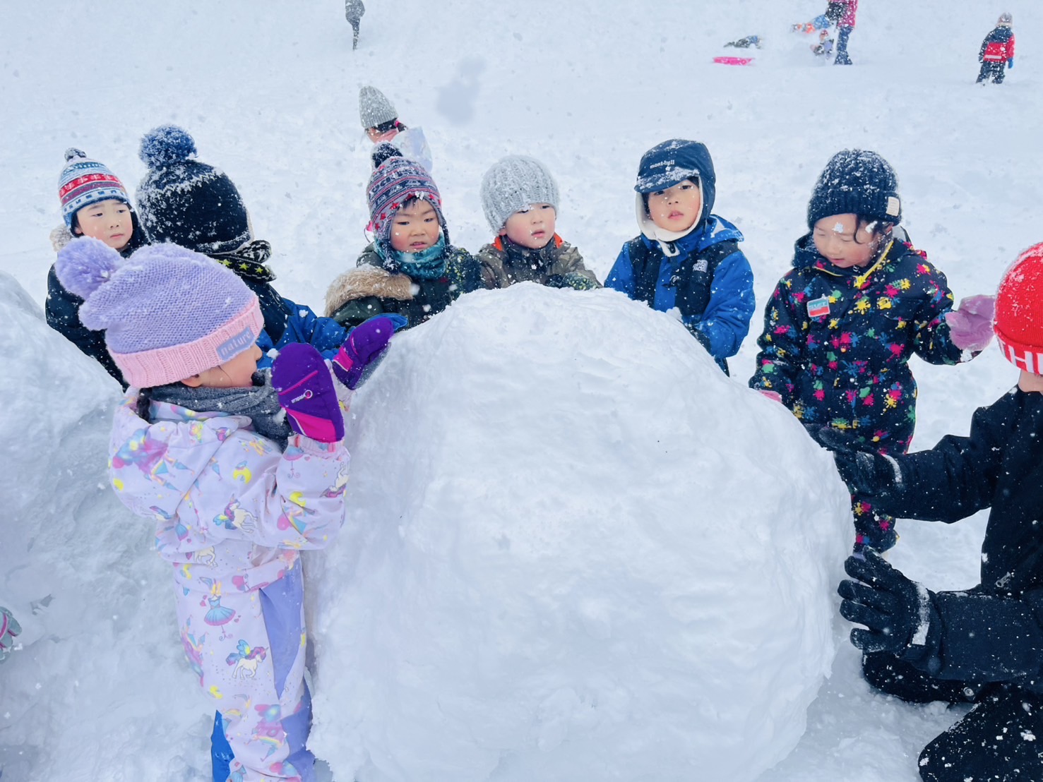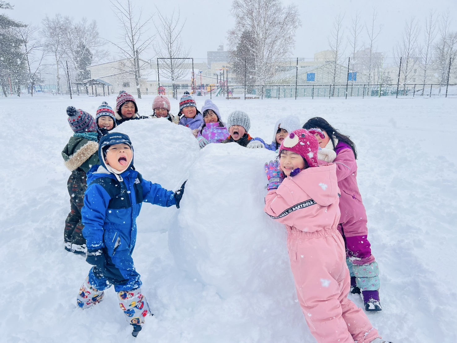 大きな雪玉2つをみんなで力を合わせて重ねると~、、、