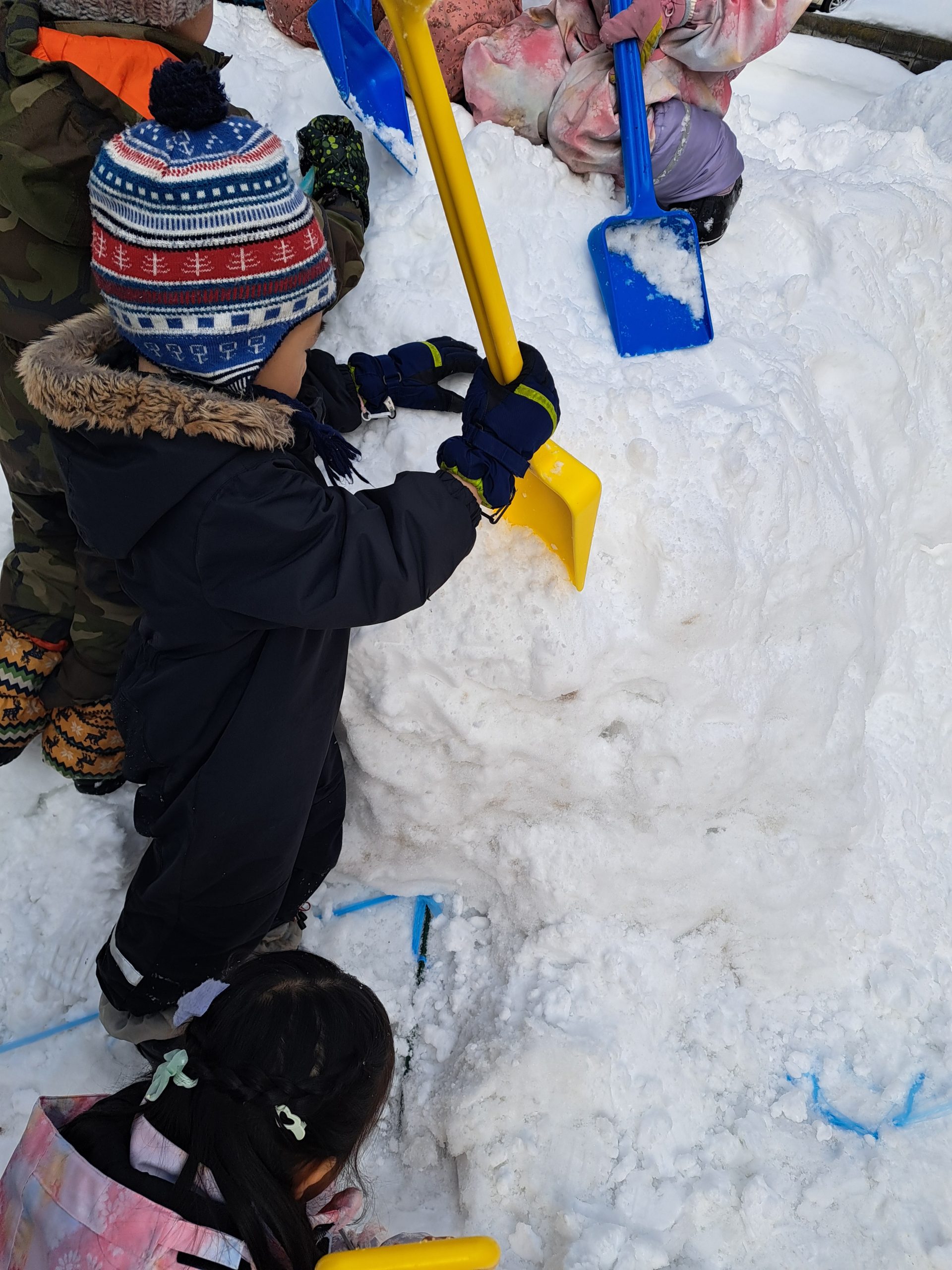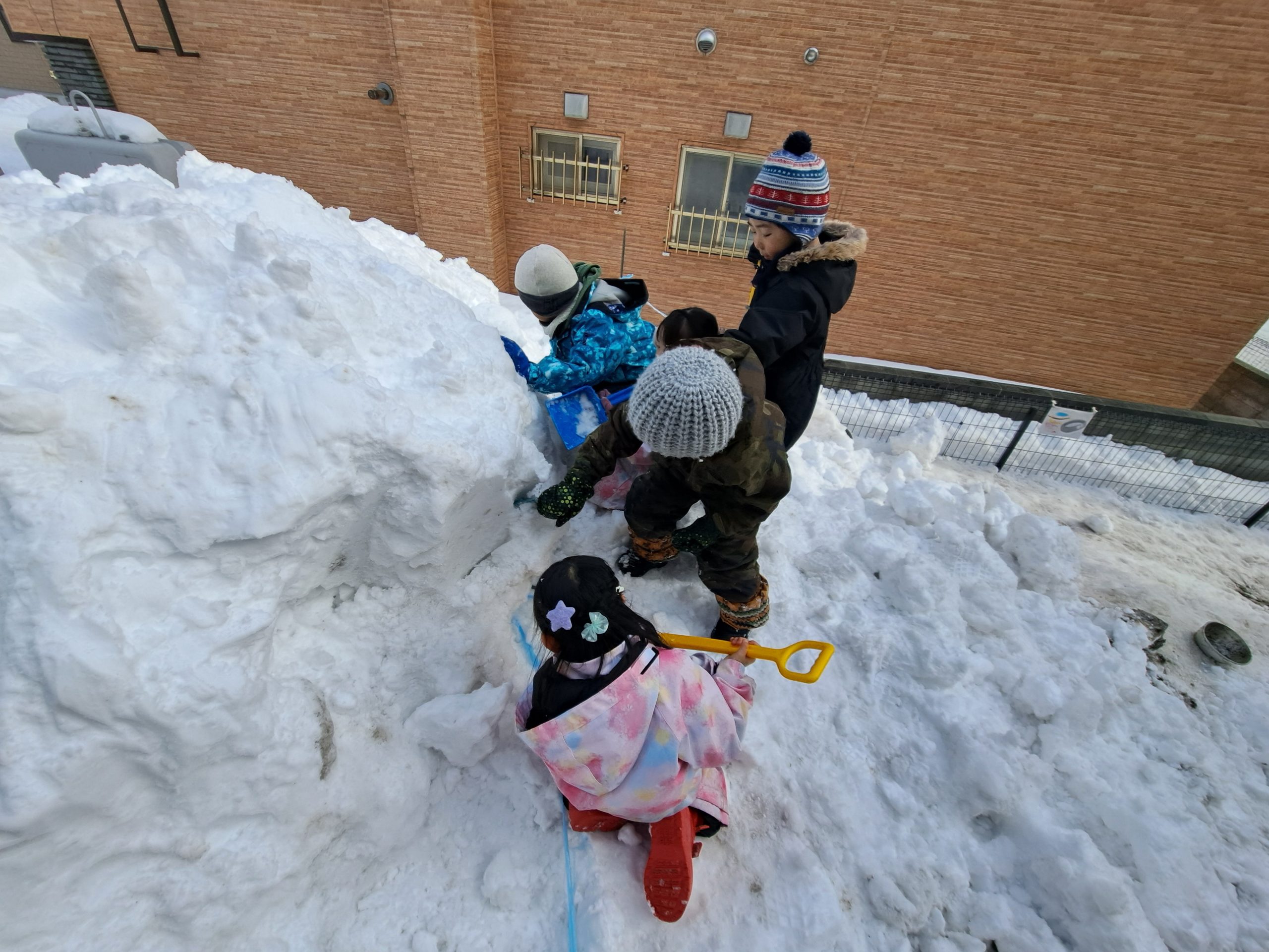 除雪が入り、雪山も大きくなり、駐車場側にある小さい雪山を整備していた保育者。