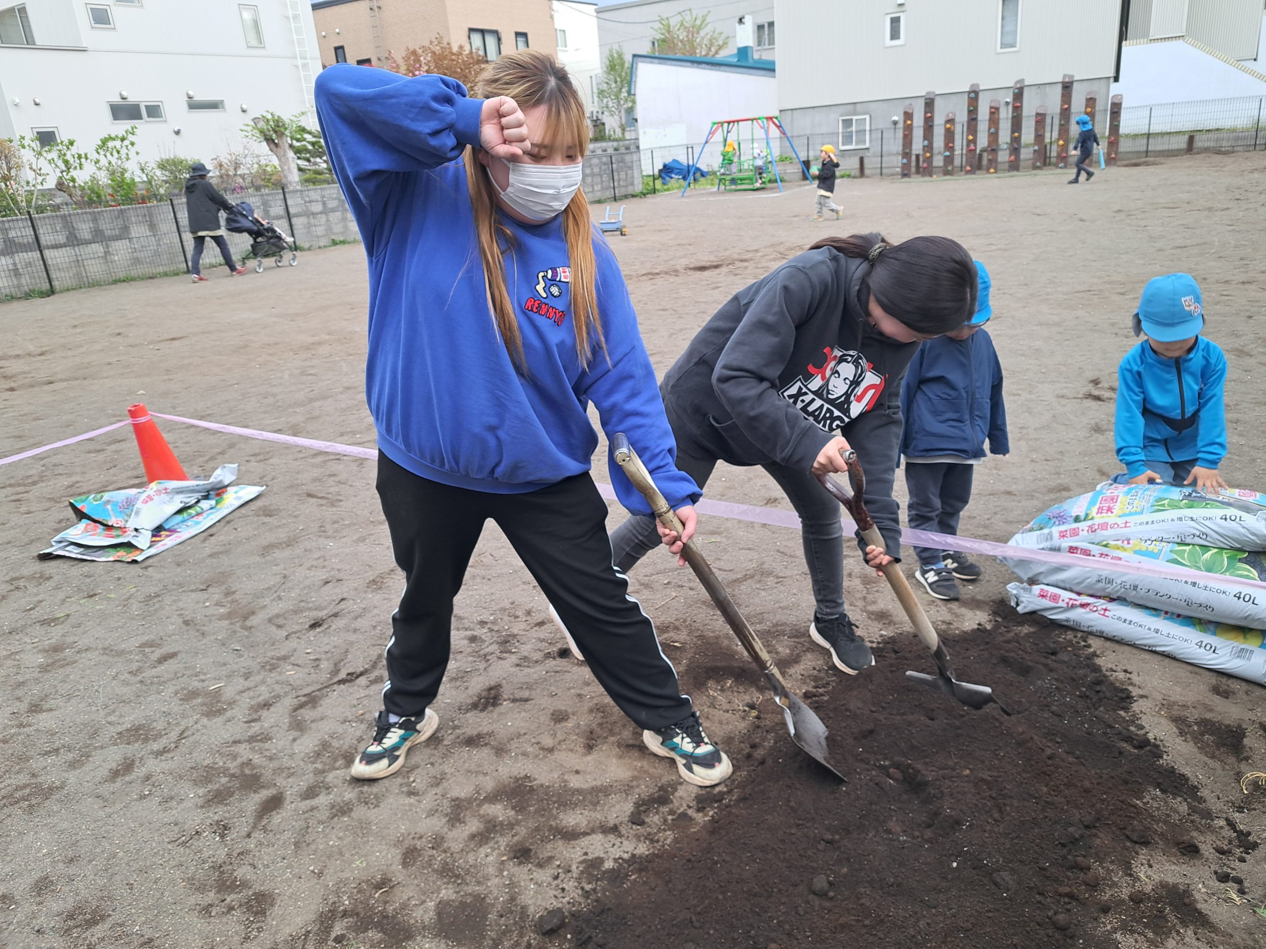 園庭で、園きっての美女たちが、土いじりをして遊んでいました♪