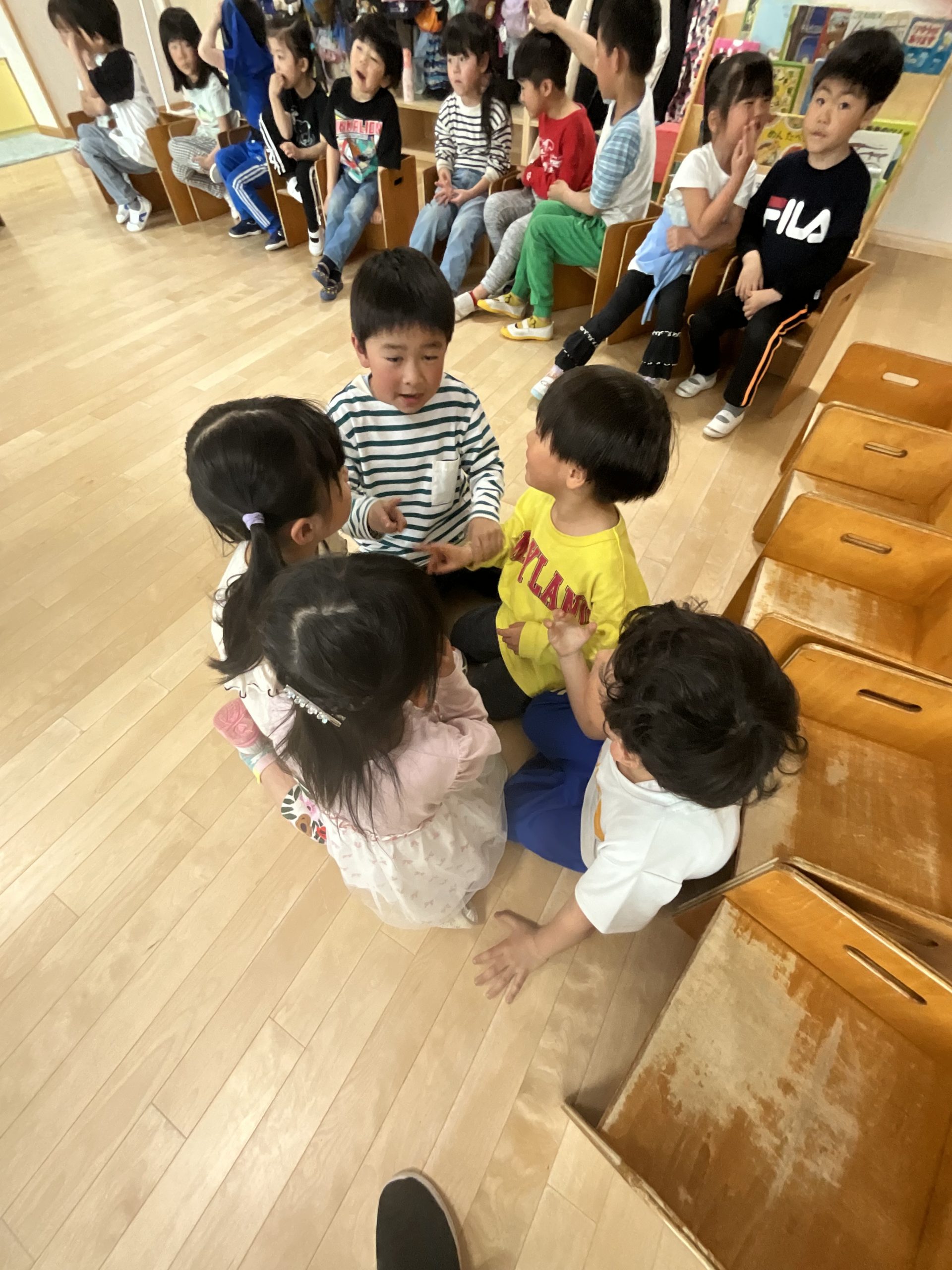 これから、このような活動が増えていきます! 意味として、長い間一緒に過ごした「いつものお友だち」という輪だけではなく、様々なお友だちとの関係の間で、意見を出し合ったり、受け止め合って、協力していく力を付けていってほしいからです☆