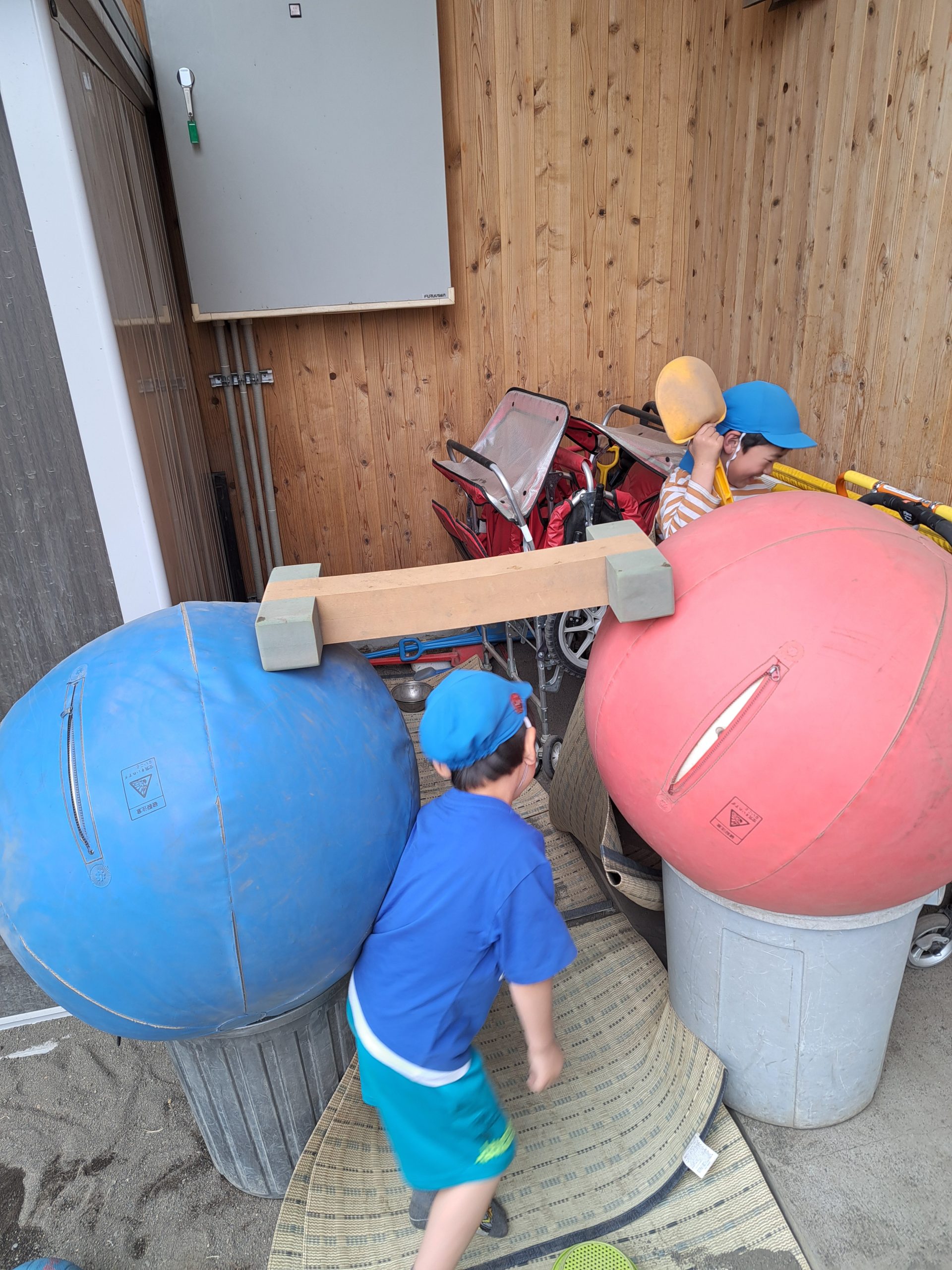 隅の隅の隅っこで、大玉や、ゴザ、大きなバケツを使っておうちを作って遊んでいました♪