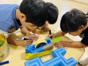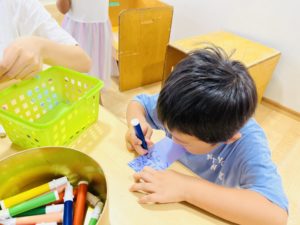 先生達とお話をしながら文字や絵を書いています
