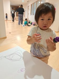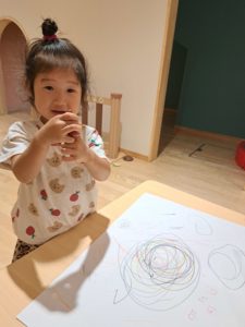 色々なものを描いたり、この日はクレヨンを出したので、指に入れて遊んだり、していました♪