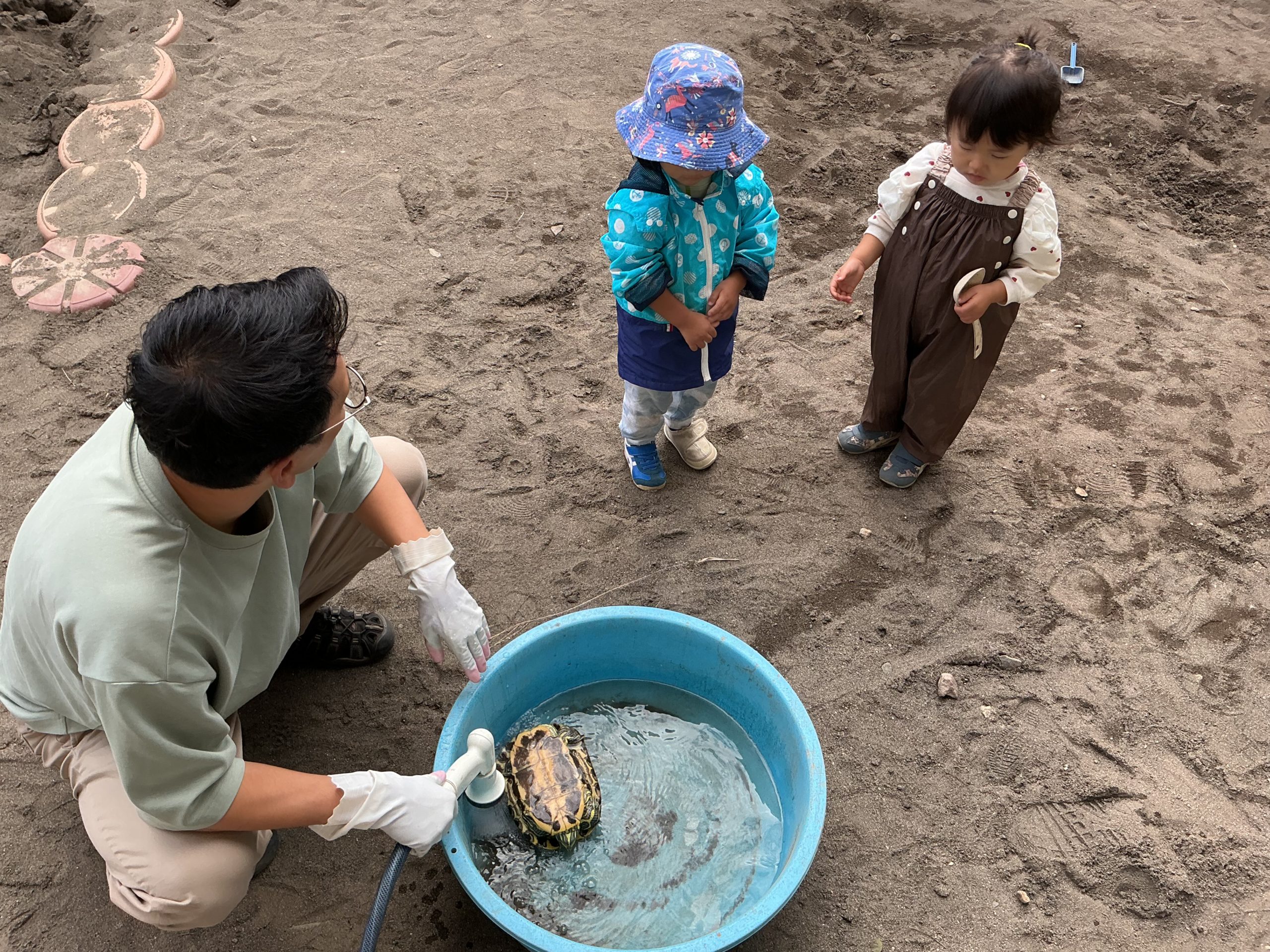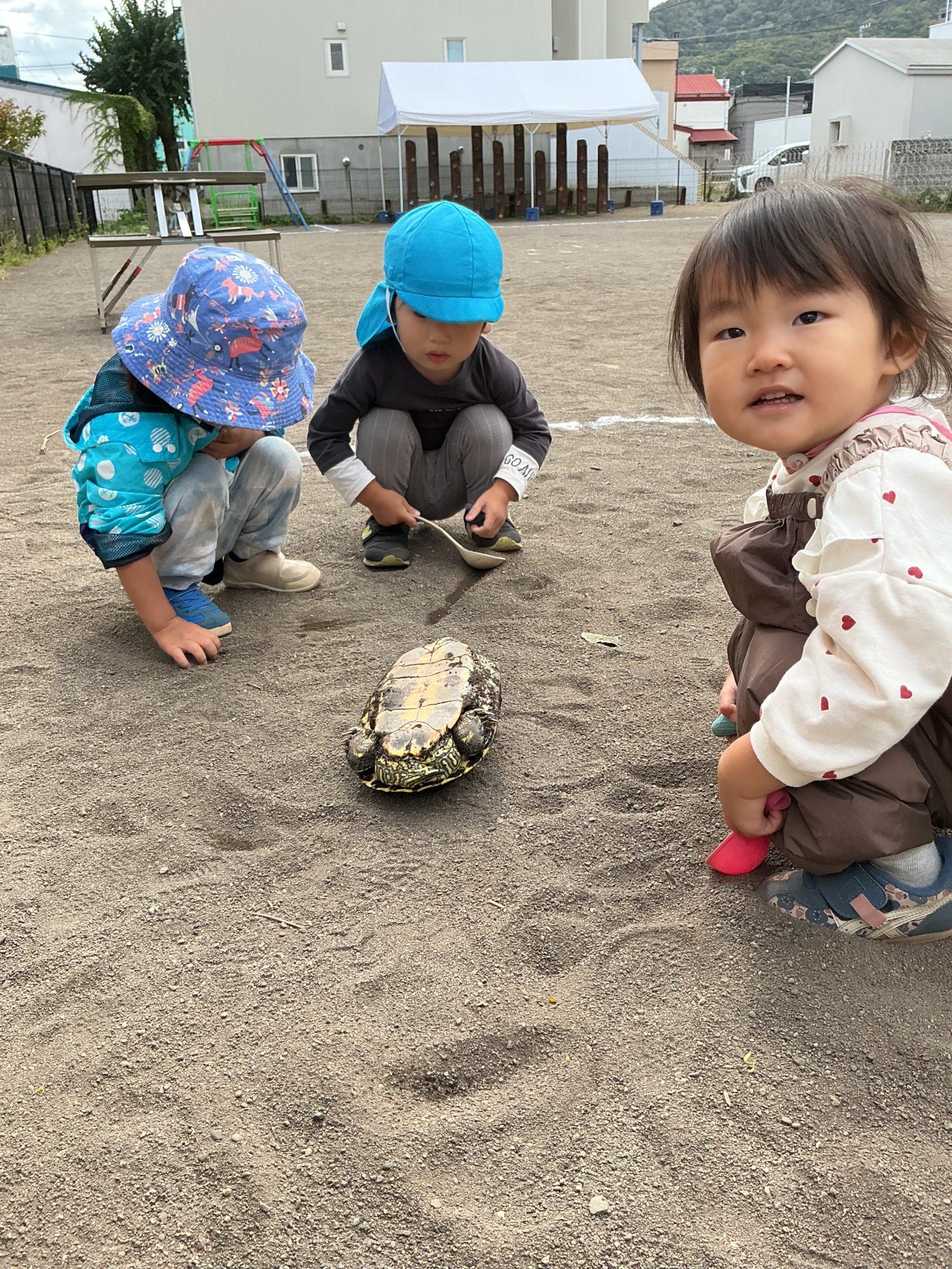 長内先生が園庭に連れてきたのは、カメ!