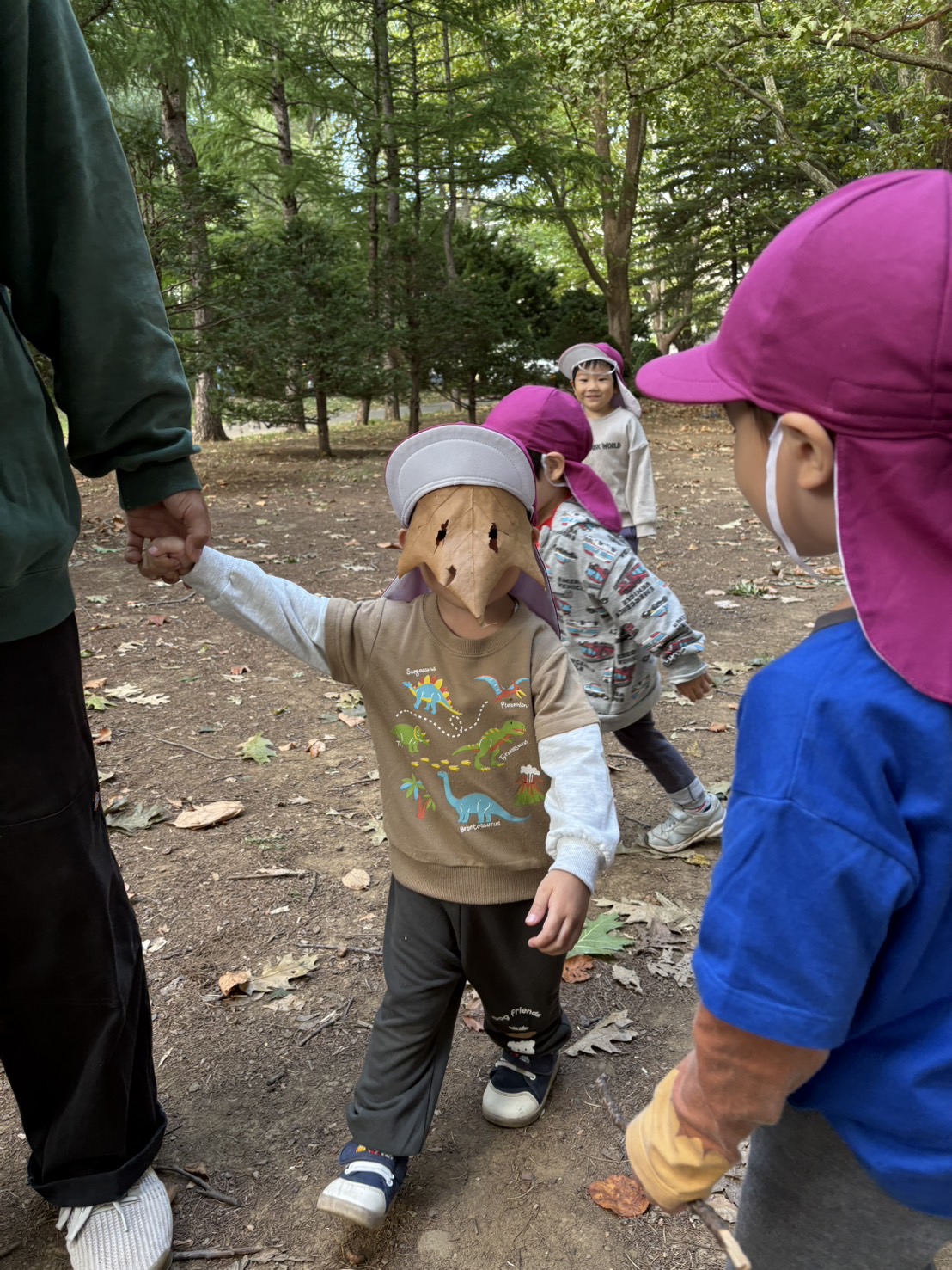 落ち葉を集めていた方向から仮面を被ったお友だちが歩いてきました🎭