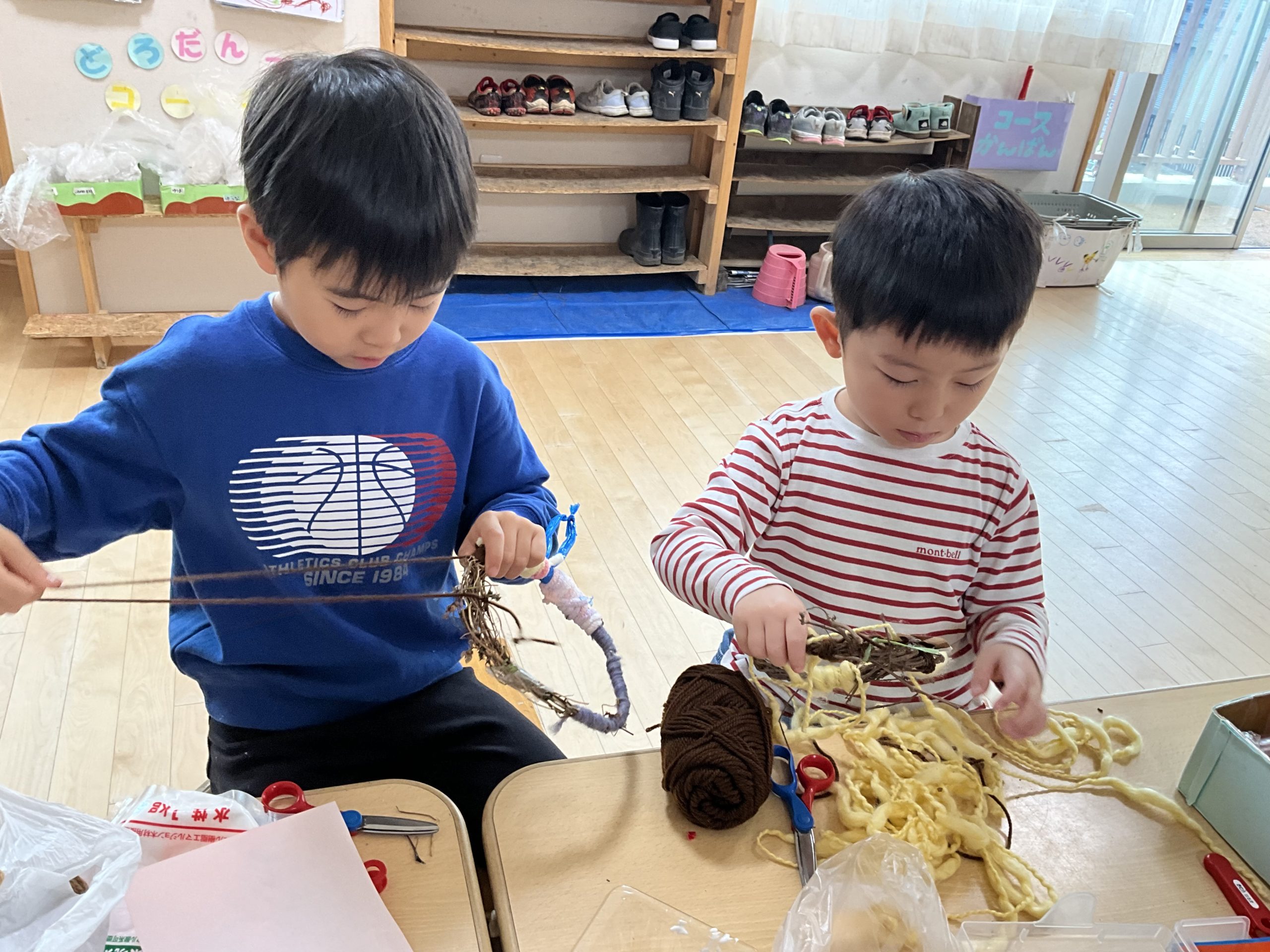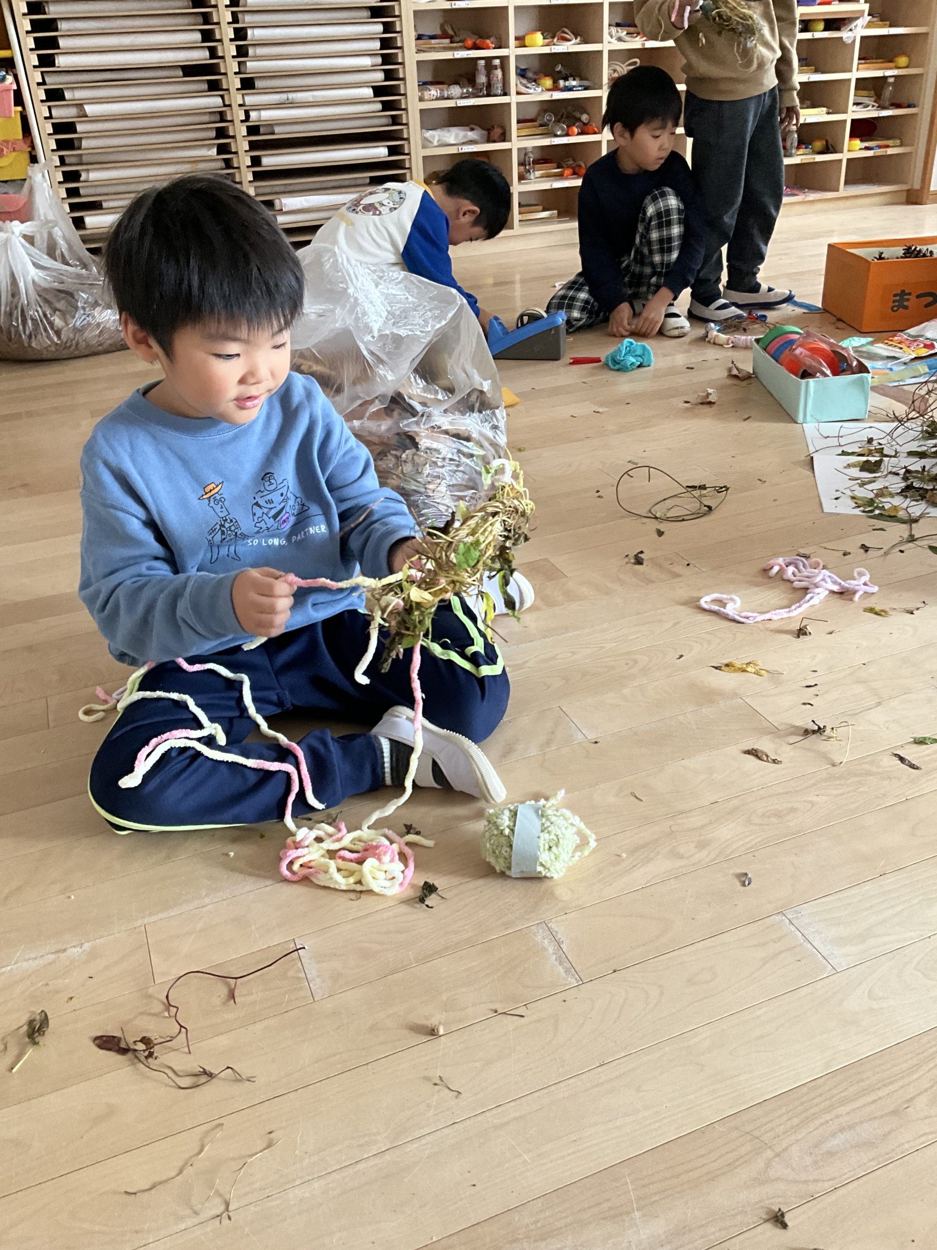 さっき見つけたものを輪っかにして毛糸をまきまき…
