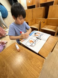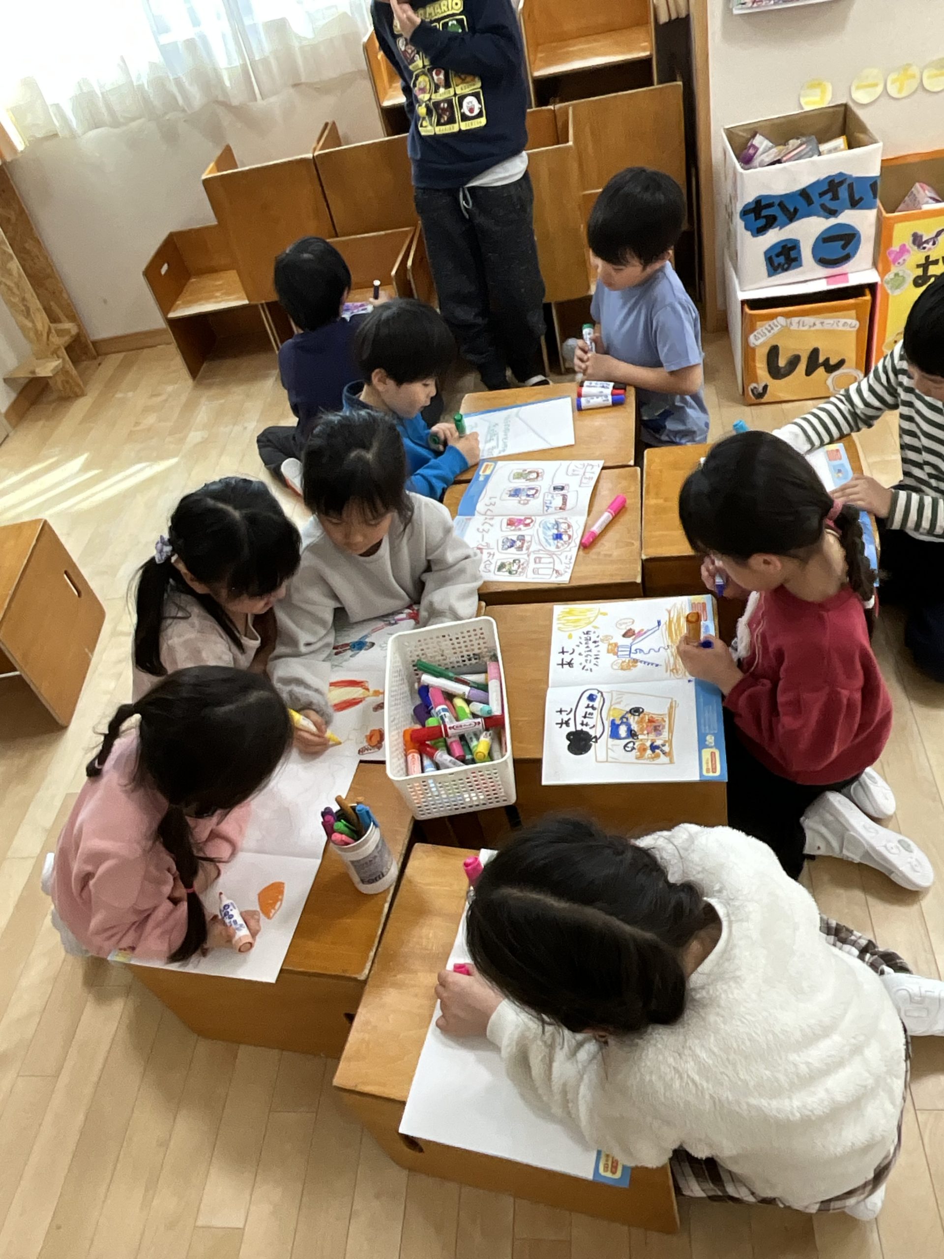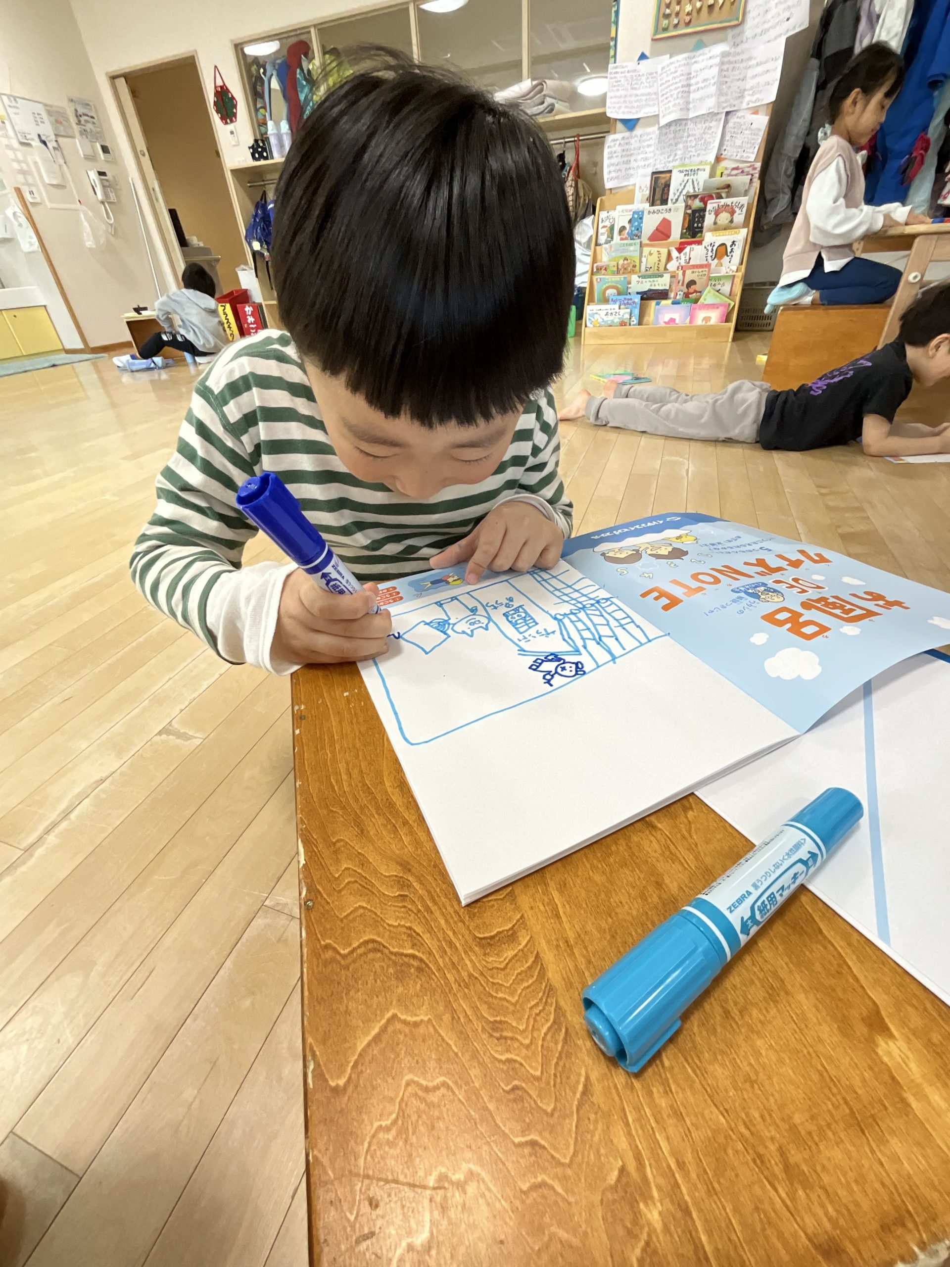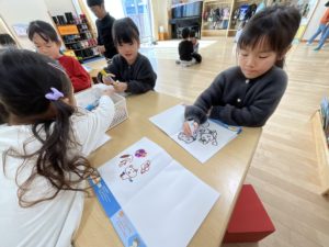 幼稚園で楽しかったことを描いたり、